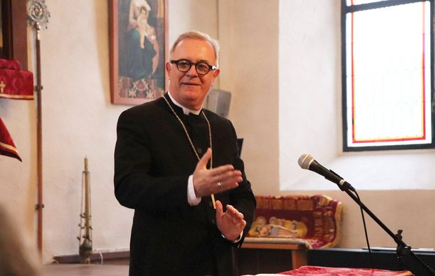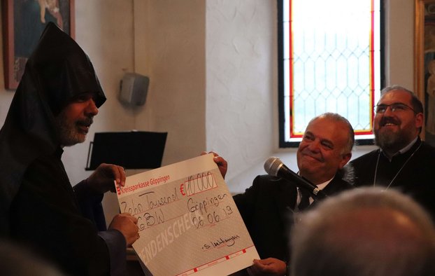 Dafür ist die Gemeinde auf Spenden angewiesen - der armenische Bischof Serovpe Isakhanyan (l.) überreichte einen symbolischen Spendenscheck über 10.000 Euro.