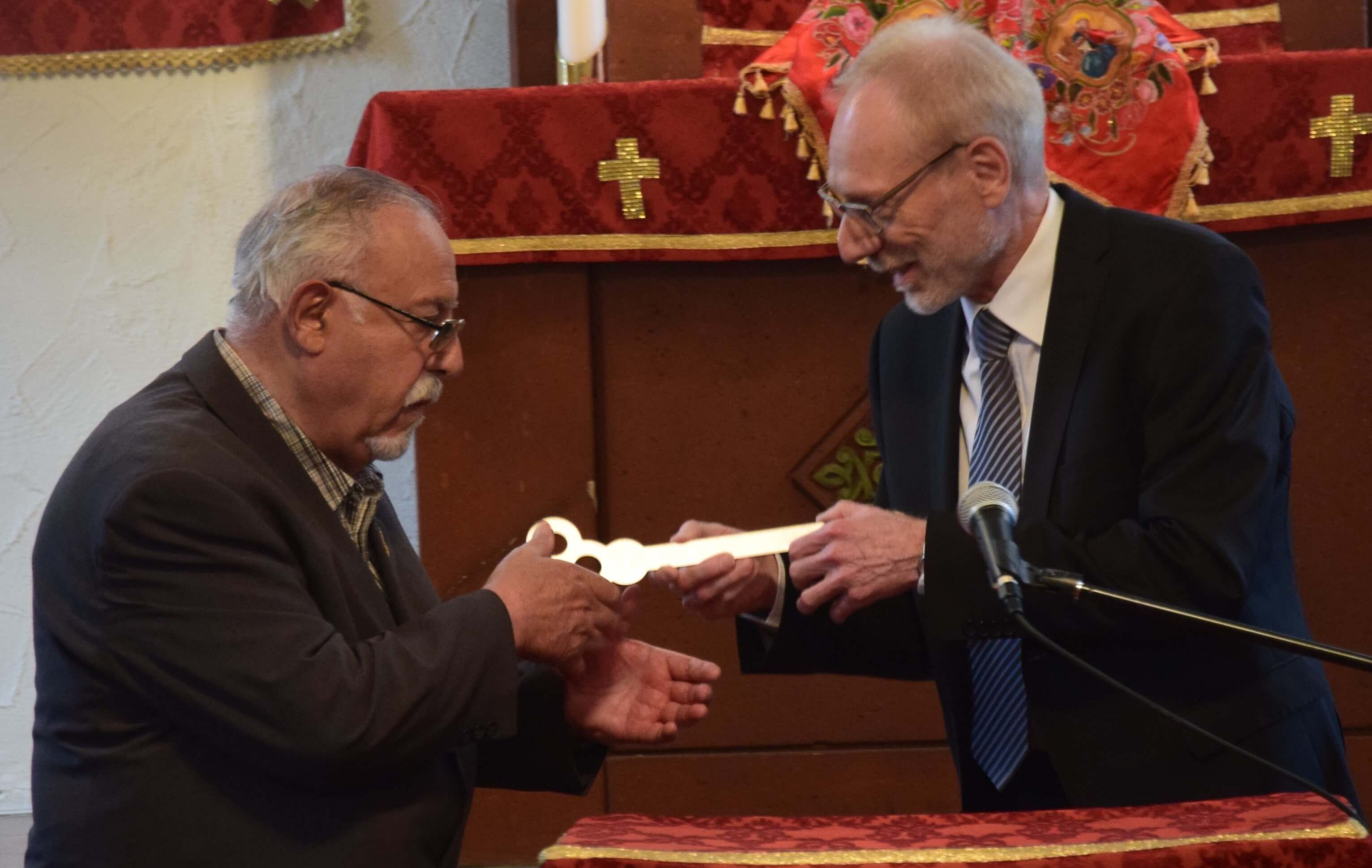Wolfgang Eichmüller (r.), Vorsitzender des evangelischen Kirchengemeinderats Bartenbach, übergab den Schlüssel symbolisch an Diakon Arman Pilibosjan, den dienstältesten Diakon der Armenischen Kirche in Deutschland.