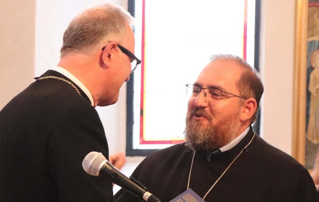 Der evangelische Landesbischof Dr. h.c. Frank Otfried July (l.) beglückwünschte den armenischen Gemeindepfarrer Dr. Diradur Sardaryan zum nun offiziell vollzogenen Eigentümerwechsel.