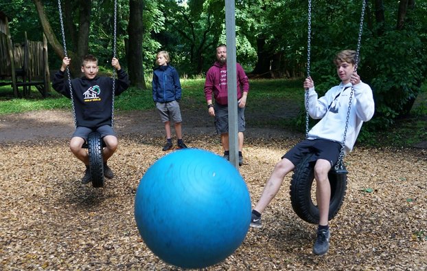 Was machen die Kinder besonders gern? „Ganz eindeutig Schaukelball spielen“, sagt Stengle und lacht. Das populärste Waldheimspiel war eine Zufallserfindung vor etwa 20 Jahren. Ein Fußball war in die Mitte der Sechseck-Schaukel gerollt. Ein Betreuer, der auf einem der sechs Autoreifen saß, kickte ihn aus der Runde.