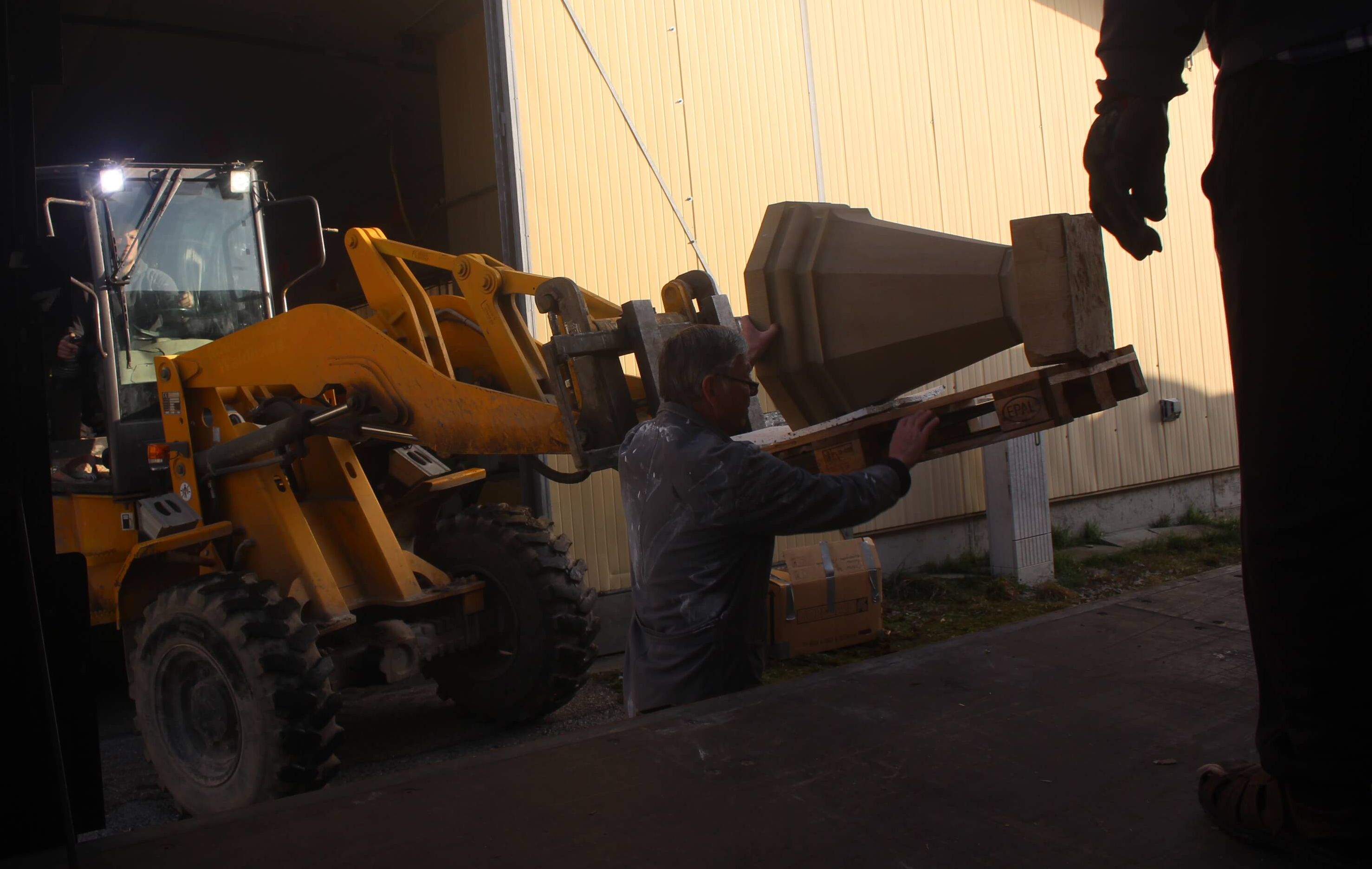 Der ebenfalls aus den 1950er Jahren stammende Taufstein wird verladen.