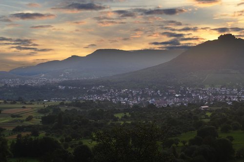 Blick vom Osthang des Jusi auf den Albtrauf: Auf dem erloschenen Vulkankegel feiert die Apis, der Evangelische Gemeinschaftsverband Württemberg, Ende Juli „100 Jahre Jusi-Fest".