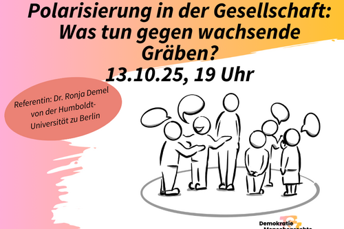 Zum Auftakt der Reihe gibt am Montag, 13.10., Dr. Ronja Demel einen Einblick in die aktuelle Forschung zum Thema „Polarisierung in der Gesellschaft: Was tun gegen wachsende Gräben?“.