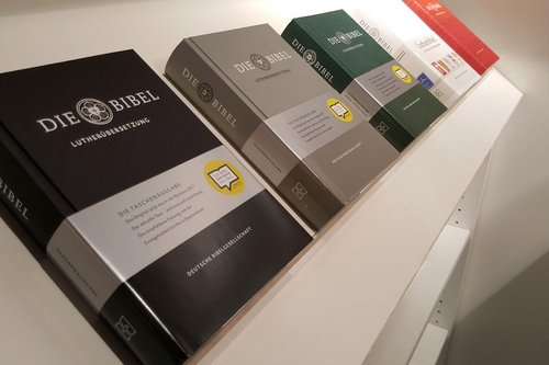 Ausgaben der Lutherbibel 2017 auf dem Messestand der Deutschen Bibelgesellschaft.