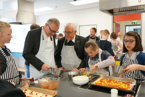 Landesbischof July und Bischof Fürst backen mit den Schülerinnen und Schülern gemeinsam Pizza.
