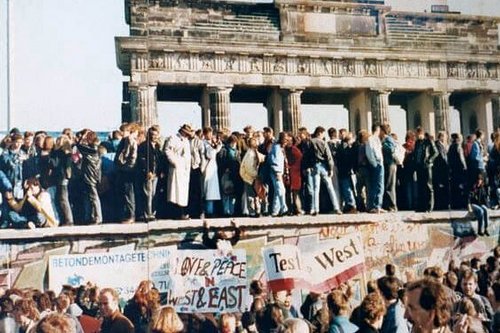 Feiernde Menschen auf der Berliner Mauer 1989.
