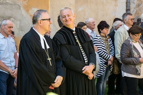 Nach dem Festgottesdienst in der Kirchenburg Grossau: Bischof Reinhart Guib der EKR und Landesbischof July.