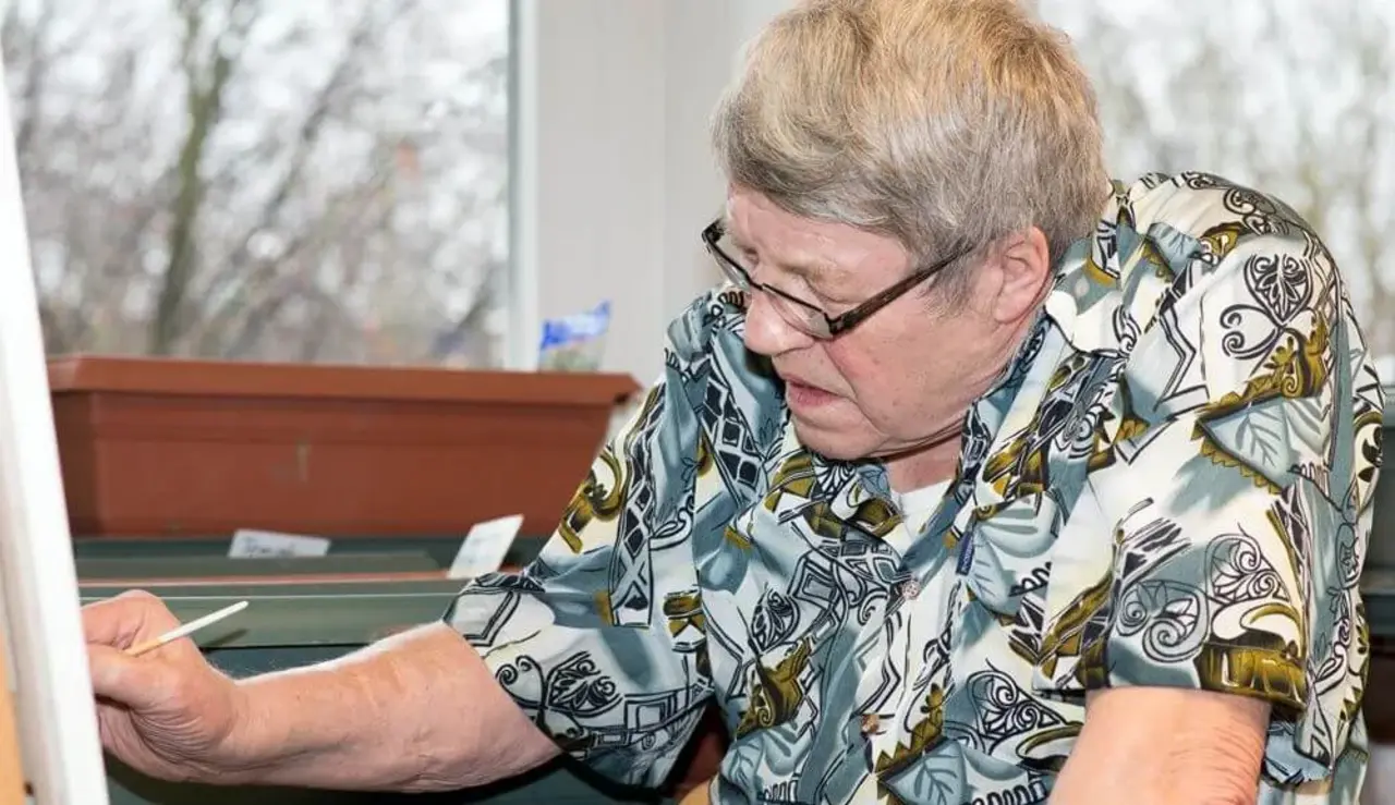 Es gibt viel Leben in der Werkstatt des Immanuel-Grözinger-Hauses. Mittendrin sitzt Jürgen Reinartz vor einer Staffelei und schwingt in meditativer Ruhe den Pinsel. In den Büros im Haus hängen mehrere Bilder von ihm. Ein Leuchtturm hatte Sozialarbeiter Rainer Abweser gefallen, da hat Reinartz ihm das Bild geschenkt. Seine bunten Werke zeigen einen fröhlichen Blick auf die Welt. Als ob da einer mit sich selbst im Reinen ist, ganz ohne Bitterkeit. Grund, vergrämt zu sein,hätte er allerdings schon. Seine allerersten Lebenstage verbrachte Reinartz im Keller. Weil Bomber das Krankenhaus im Hochsauerland angriffen, in dem er 1944 geboren wurde.