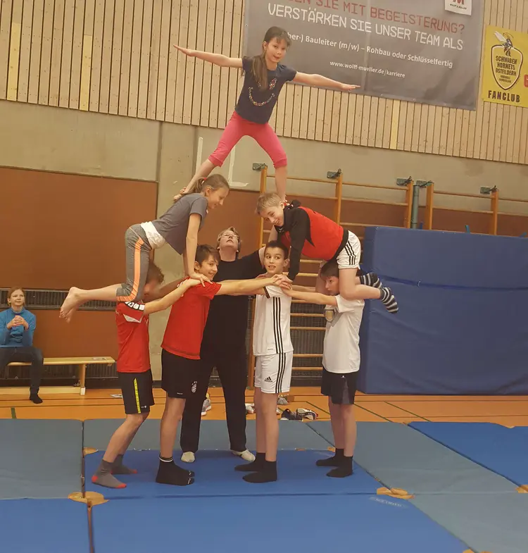 Sebastian Eberhardt, Sportlehrer am Otto-Hahn-Gymnasium Ostfildern, setzt diese Menschenpyramiden im Sportunterricht ein. „Ich habe in fünften Klassen oft das Problem, dass Jungs nicht mit Mädchen zusammenarbeiten wollen und sich Grüppchen bilden. Wenn die Sportpädagogin der Stiftung Gegen Gewalt an Schulen kommt, arbeiten sie alle zusammen. Es ist ihnen egal, wer mit wem ins Team kommt“, sagt der Sportlehrer. „Das Schöne an den Pyramiden-Übungen ist, dass man den Kindern gar nicht erklären muss, worum es geht. Sie verstehen selbst, dass es hier auf Teamarbeit ankommt."