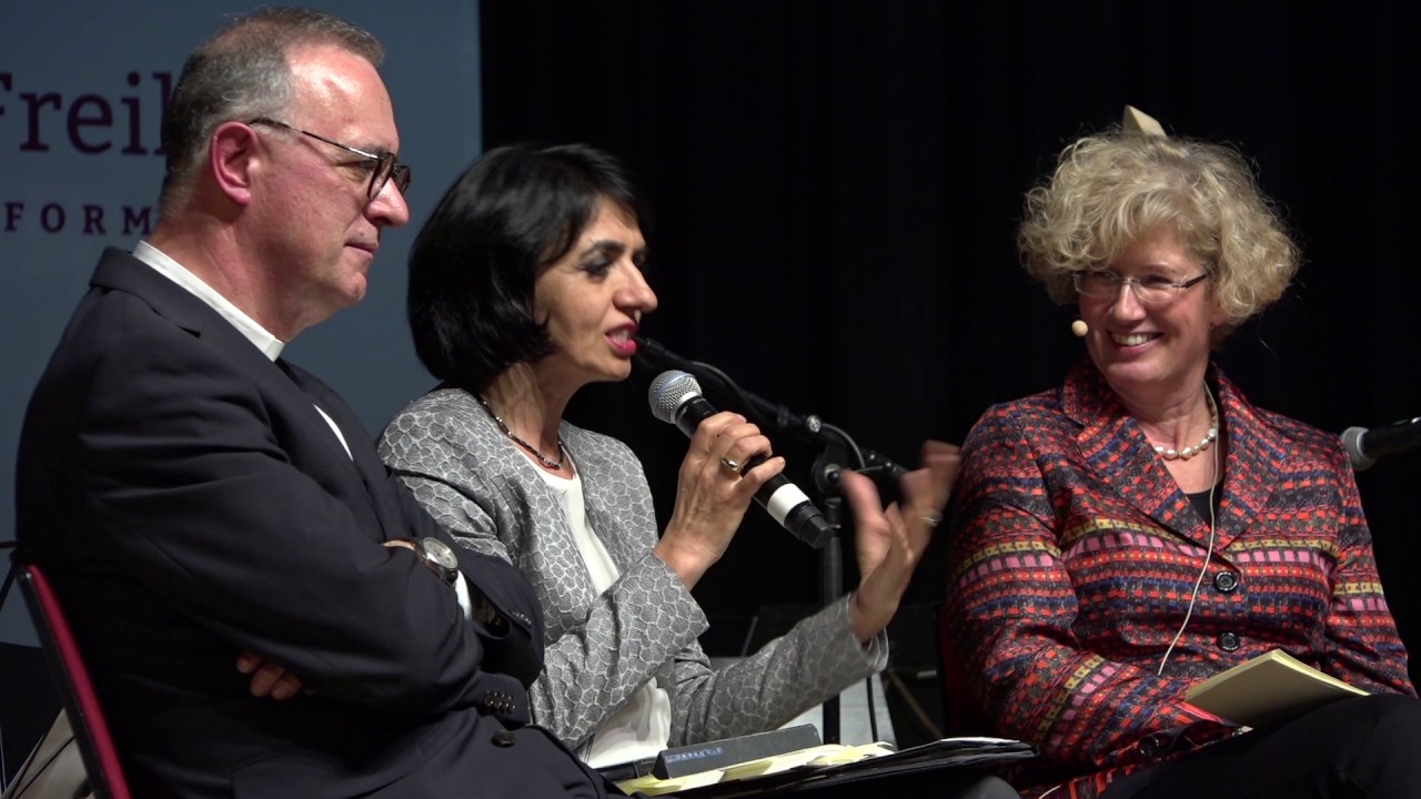 Luthers Schrift „Von der Freiheit eines Christenmenschen“ wird an diesem Abend aber nicht nur gelesen, sondern auch diskutiert. Die Reformationsbeauftragte Dr. Christiane Kohler-Weiß hat dazu Muhterem Aras, Präsidentin des Landtags von Baden-Württemberg, Landesbischof Dr. h. c. Frank Otfried July, Dr. med. Johannes Hub, Facharzt für Psychosomatische Medizin und Psychotherapie, und Gefängnisseelsorgerin Susanne Büttner auf das Podium eingeladen. Diskussions- und Gesprächsstoff liefert Luthers Schrift genug. Landtagspräsidentin Aras überlegt, ob sie sich als Nicht-Christin im lutherischen Verständnis überhaupt „frei“ fühlen darf und wird von Landesbischof July ausdrücklich dazu ermuntert, sich so frei wie möglich zu fühlen. Luther wolle ja gerade zeigen, dass jedem Menschen Würde und Gottes Liebe frei geschenkt ist. Von dieser geschenkten Liebe und inneren Freiheit berichten auch Gefängnisseelsorgerin Büttner und Psychosomatiker Hub, deren Berufsfelder zunächst wenig mit Freiheit zu tun haben.