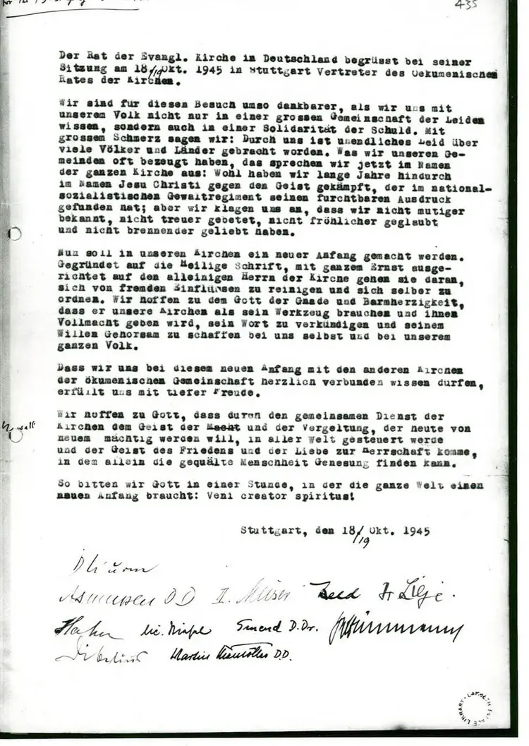 Auf einer Ratstagung der unmittelbar nach Ende des Zweiten Weltkrieges neugebildeten Evangelischen Kirche in Deutschland (EKD) wurde am 19. Oktober 1945 in Stuttgart ein Text verlesen und verabschiedet, der als „Stuttgarter Schuldbekenntnis“ in die Kirchengeschichte eingegangen ist. Die Verfasser hatten erkannt, dass die evangelischen Kirchen in Deutschland während des so genannten Dritten Reichs und damit in einer Zeit des Unrechtes und der brutalen Gewalt weitgehend versagt hatten.