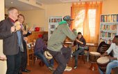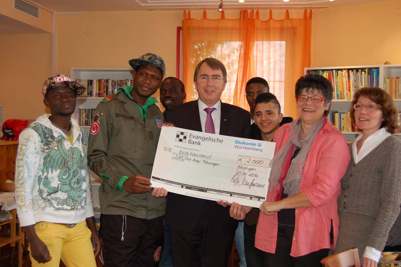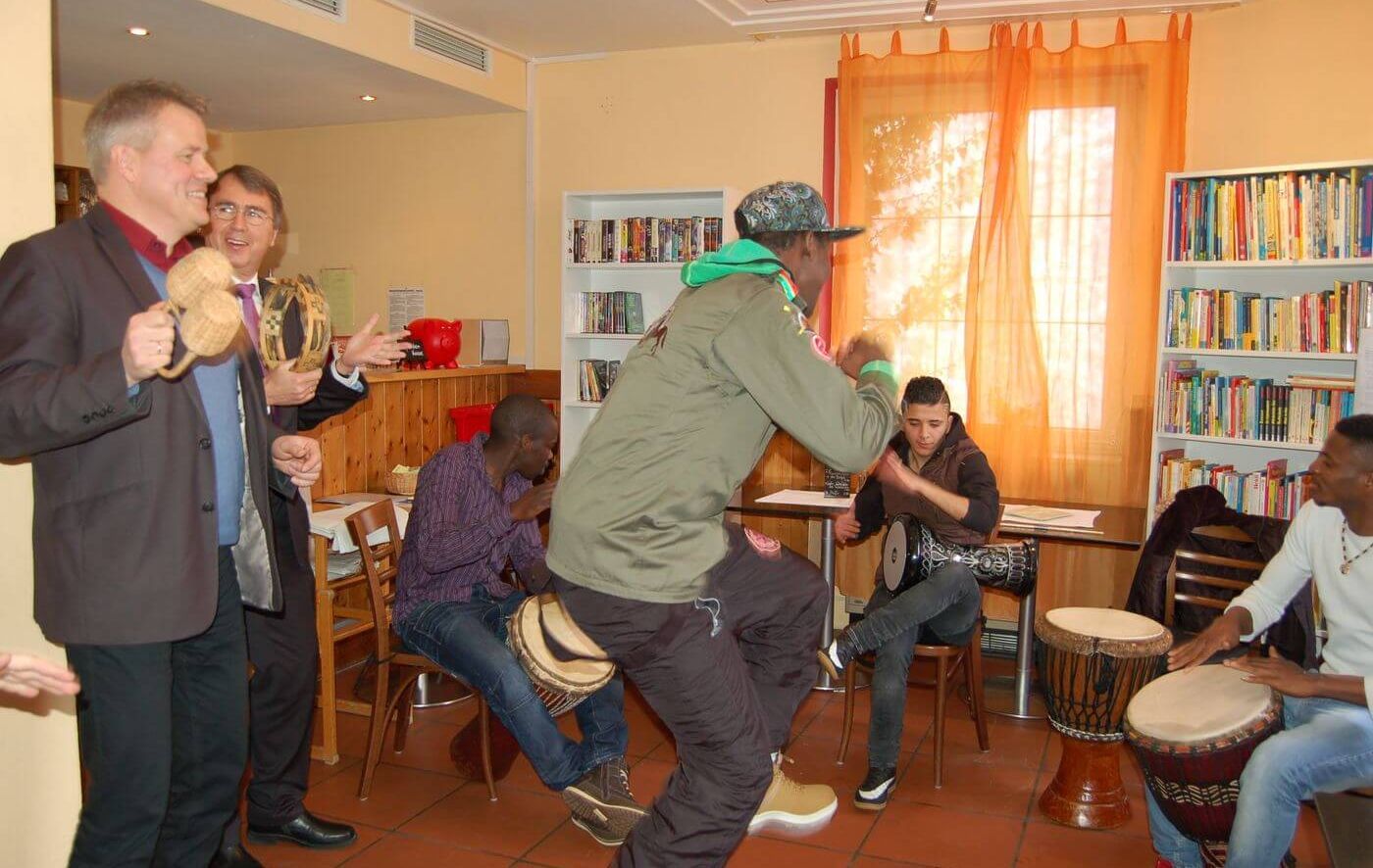 Oberkirchenrat Dieter Kaufmann hat heute dem Arbeitskreis Asyl Münsingen einen Zuschuss mit der beantragten Höchstfördersumme von 2.000 Euro aus dem Fonds für Flüchtlingsprojekte der Evangelischen Landeskirche überreicht. Die Trommelgruppe, junge Männer aus der Gemeinschaftsunterkunft für Flüchtlinge, freut sich auf eigene Instrumente und bedankte sich mit einem mitreißenden Exklusiv-Konzert in der Begegnungsstätte Germania in Münsingen. Acht ausgeliehene Djembe-Trommeln müssen bald zurück gebracht werden. Für die Anschaffung eigener Trommeln hat der AK Asyl Münsingen das Geld beantragt.