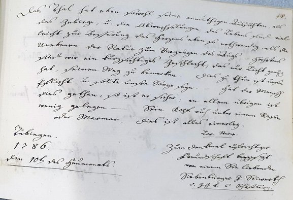Ein württembergischer Theologiestudent namens Ruoff hatte darin seine „Amicis et Fautoribus“ - seine Freunde und Förderer - Widmungen, gute Wünsche und Ratschläge notieren lassen. Als dem Archiv dieses Büchlein angeboten wurde, haben die Mitarbeiter dankend angenommen. Geld gibt's übrigens nicht: „Wir übernehmen die Werke als Schenkung oder Dauerleihgabe."