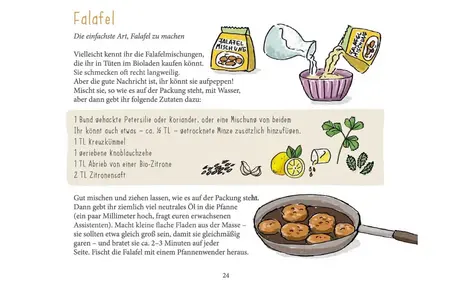 Herzhafte und süße Rezepte, Vorspeisen, Hauptspeisen, Desserts und Beilagen finden sich im Kochbuch - auch die oben abgebildeten Falafel und der Hirsebrei.