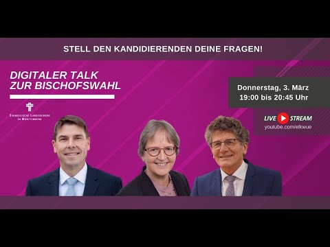 Eine weitere Möglichkeit, sich einen Eindruck von den drei Kandidierenden zu machen, bietet eine digitale Podiumsdiskussion mit den Kandidierenden, die am 3. März stattgefunden hat. Sie finden die Aufzeichnung im Youtube-Channel der Landeskirche und weiter unten auf dieser Seite. Unten finden Sie auch eine „Alpha & Omega“-Sendung des Evangelischen Medienhauses, in der sich die Kandidierenden vorstellen.