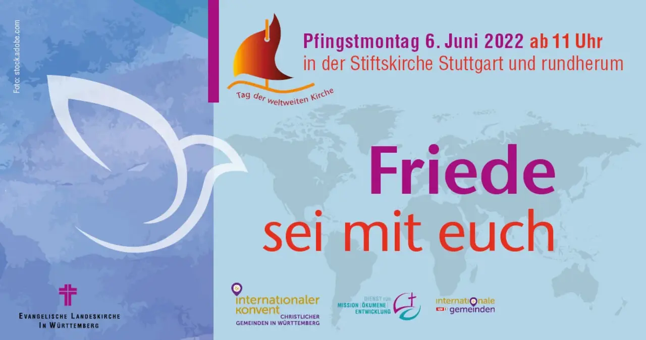 Am Pfingstmontag, 6. Juni, wird das Areal rund um die Stuttgarter Stiftskirche zum internationalen Treffpunkt. Der Tag der weltweiten Kirche steht ganz unter dem Thema „Friede sei mit euch“, das bereits im Herbst festgelegt worden ist.Im Gottesdienst um 11:00 Uhr kommen Gäste aus Kamerun, Korea und der Ukraine zu Wort.