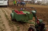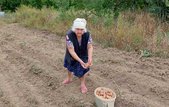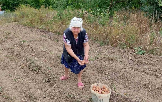 Eine Frau, die von der Ostukraine nach Transkarpatien geflüchtet ist, erntet Kartoffeln, vermutlich auf einem Feld, das ein Saathelfer aus Brackenheim des Gustav-Adolf-Werks, Albrecht Döbler, im Frühjahr dort bearbeitet hat.