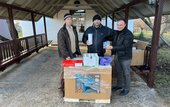 Pfarrer Péter Szeghljánik und andere Gemeindeglieder freuen sich über eine Hilfslieferung, darunter ein Generator.