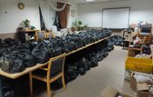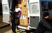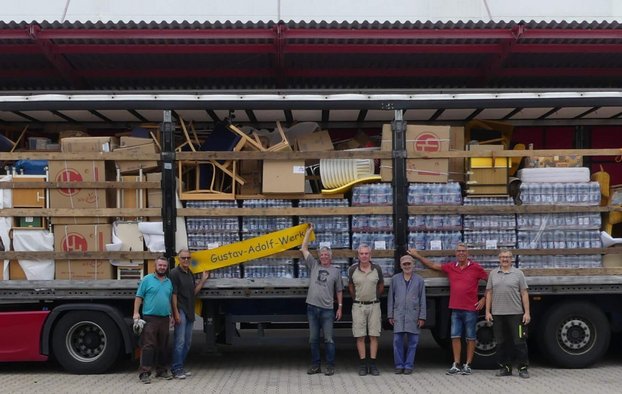 Zahlreiche Ehrenamtliche des Gustav-Adolf-Werks Württemberg helfen mit, die Hilfslieferungen zu verstauen.