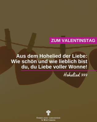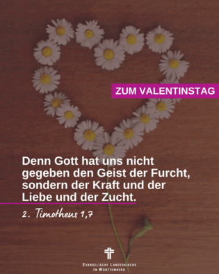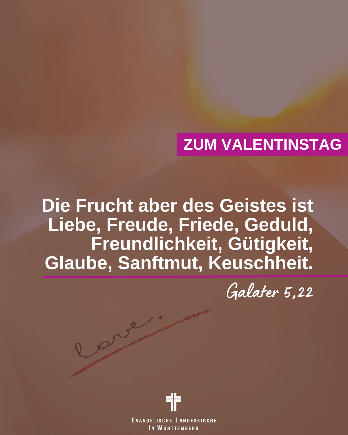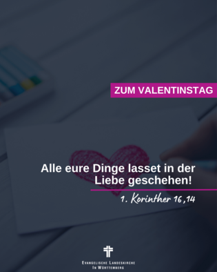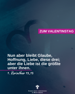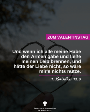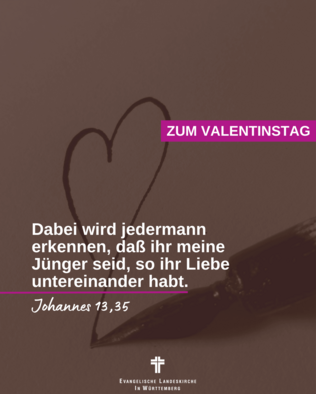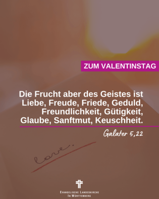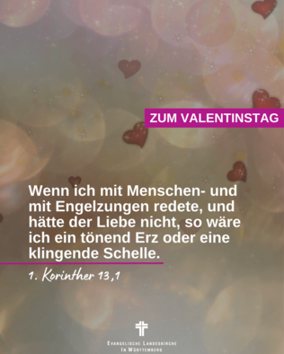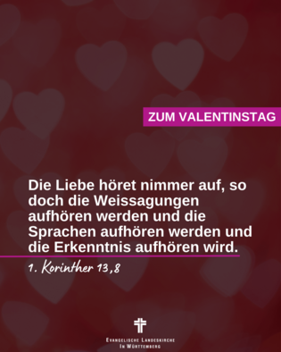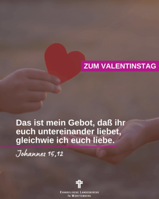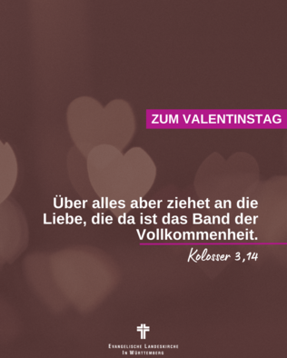 14. Februar, Valentinstag, der Tag der Liebe! Die Liebe zwischen den Menschen, die Liebe zum Nächsten, zum Notleidenden, die ewige Liebe zwischen Gott und den Menschen - das ist ein großes Thema in der Bibel. Im Folgenden finden Sie ausgewählte Bibelverse rund um die Liebe. Kleiner Tipp: Es müssen nicht immer Blumen sein - ein gutes Bibelwort sagt mehr als tausend Blumen ...