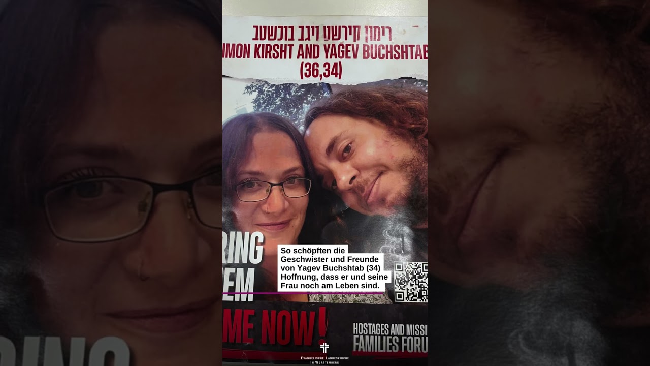 „Wir wollen ihre Geschichte erzählen und an die Entführten erinnern. Sie sind nicht nur eine Nummer“, so Yagevs Schwester Nufar. Buchshtab Freundin Ofra Raz fügt hinzu: „Die Entführten sind Familie, Kollegen, Lehrer, Freunde – bei uns kennt jeder jeden. Wir brauchen Hilfe, um jede Geisel zurückzubekommen. Es sind besondere Menschen und wir müssen ihre Gesichter zeigen.“ Ofra Raz steht vom Tisch auf, an dem das Gespräch stattfindet, und holt ein Poster, das Yagev Buchshtab mit seiner Frau zeigt. „Bring them home now!“ steht dort in großen Buchstaben neben einem Bild, das das junge Ehepaar zeigt. Kathrin Nothacker, Personaldezernentin im Oberkirchenrat der Evangelischen Landeskirche in Württemberg, sagt: „Es ist etwas anderes, die Gesichter zu sehen und die Geschichten zu hören, als nur die Zahlen zu hören. Es ist ein Alptraum, niemand hätte sich so etwas vorstellen können.“