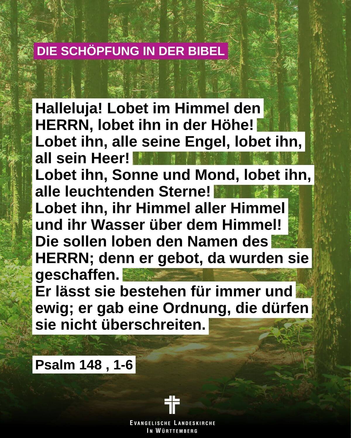 Halleluja! Lobet im Himmel den HERRN, lobet ihn in der Höhe! Lobet ihn, alle seine Engel, lobet ihn, all sein Heer! Lobet ihn, Sonne und Mond, lobet ihn, alle leuchtenden Sterne! Lobet ihn, ihr Himmel aller Himmel und ihr Wasser über dem Himmel! Die sollen loben den Namen des HERRN; denn er gebot, da wurden sie geschaffen. Er lässt sie bestehen für immer und ewig; er gab eine Ordnung, die dürfen sie nicht überschreiten.