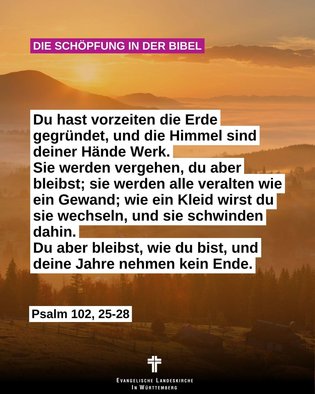 Du hast vorzeiten die Erde gegründet, und die Himmel sind deiner Hände Werk. Sie werden vergehen, du aber bleibst; sie werden alle veralten wie ein Gewand; wie ein Kleid wirst du sie wechseln, und sie schwinden dahin. Du aber bleibst, wie du bist, und deine Jahre nehmen kein Ende.