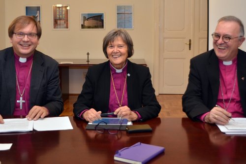 Dr. Tamás Fabiny, Bischof der Evangelisch-lutherischen Kirche Ungarns, Bischöfin Helga Haugland Byfuglien (Norwegen) und der württembergische Landesbischof Dr. h. c. Frank Otfried July (vlnr).