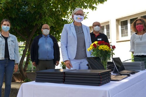 Gruppenbild mit 20 Computern: Sabine Foth (Mitte) übergab die PCs im Namen der Landessynode an die Evangelische Kirchengemeinde Wangen. Im Sicherheitsabstand und mit Maske dabei (von rechts): Jugendreferentin Heike Ulrich, Ivan Frick von „Data Group“, KGR-Vorsitzender Michael Mischke und Stefanie Dorsch vom Jugendamt HzE.
