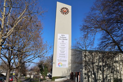 Die Kirchengemeinde in Weilimdorf hat ein riesiges Plakat am Turm der Stephanuskirche angebracht, das für Pluralismus, Teilhabe, Rechtsstaatlichkeit, Meinungsfreiheit, Streitkultur und Zivilcourage wirbt. Hier finden Sie ein Interview mit Pfarrerin Christina Baumhakl über diese Aktion.