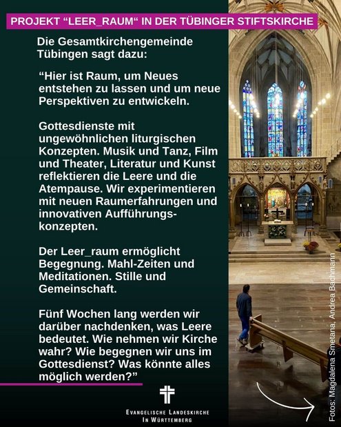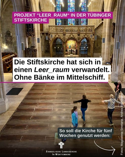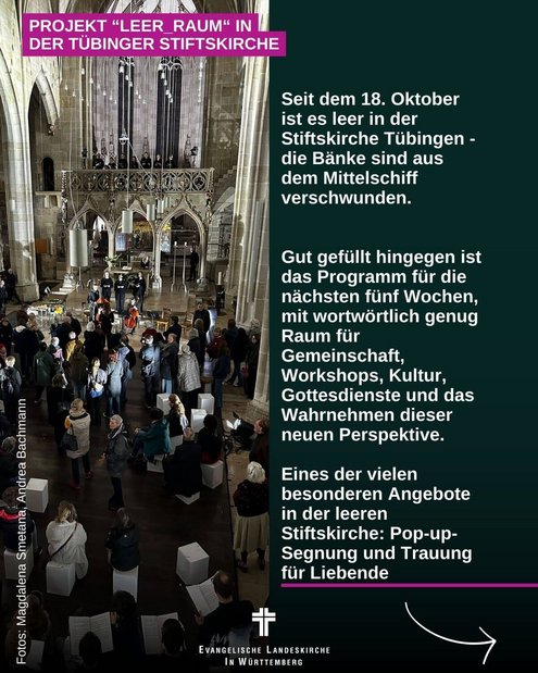 Die Tübinger Stiftskirchengemeinde hat für fünf Wochen (bis 24. November) in der Stiftskirche alle Bänke entfernt und so eine riesige leere Fläche geschaffen um auszuloten, wie sich dies auf das Erleben von Gottesdiensten, Konzerten und anderen Veranstaltungen auswirkt. Dabei experimentiert die Gemeinde auch mit ungewöhnlichen Gottesdienst-Formaten, etwa Pop-Up-Segungen und -Trauungen, einem Frauenmahl, einer Clubnacht mit DJ und einem ganz besonderen Gottesdienst für Angehörige Verstorbener.  Hinzu kommen Konzerte, Tanz-Performances, Meditationsangebote, Taizé-Gottesdienste und vieles mehr.