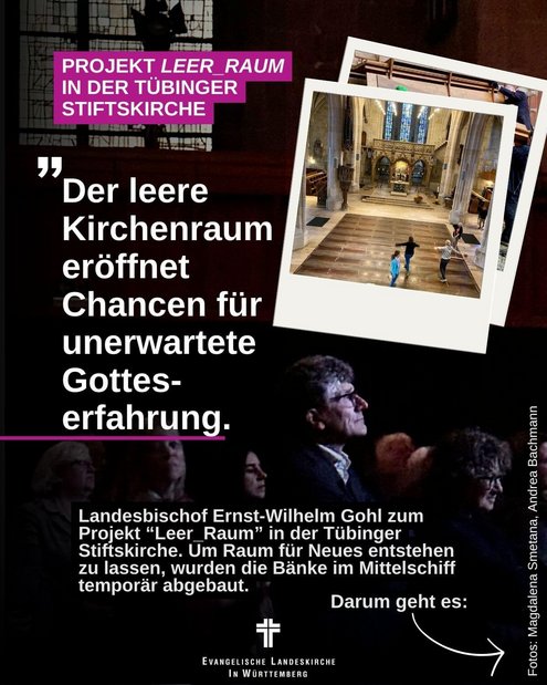 Landesbischof Ernst-Wilhelm Gohl sagt dazu: „Kirchengebäude sind für mich Leuchttürme unseres Glaubens. Wer sie betritt, erlebt: es gibt noch mehr als das geschäftige Treiben draußen. Sie sind besondere Orte der Gotteserfahrung und tragen Erinnerungen und Spuren ihrer Nutzung – oft über viele Jahrhunderte hinweg. Für die, die regelmäßig die Kirche besuchen, ist ihr Kirchengebäude aber auch wie ein Wohnzimmer ihres Glaubens. Nun wird die Tübinger Stiftskirche leergeräumt. Sie verwandelt sich in einen Leer-Raum auf Zeit. Das ist keine Vorbereitung auf eine Renovierung oder einen Umzug. Der leere Kirchenraum eröffnet Chancen für unerwartete Gotteserfahrung. Und er macht mich neugierig auf die Zeit danach, wenn wieder alles an seinem Platz ist.“