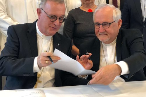 Landesbischof Dr. h. c. Frank Otfried July (l.) reicht die Rahmenvereinbarung zur Unterschrift an Bischof Dr. Gebhard Fürst weiter.