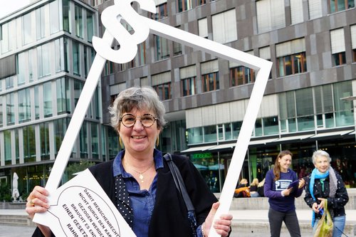 Die Stuttgarter Prälatin Gabriele Arnold mit dem symbolischen Gesetzesrahmen, den die Unterstützer der Aktion „Lieferkettengesetz“ einfordern. Im Hintergrund bittet eine Aktivistin Passanten auf dem Kleinen Schlossplatz um Unterstützer-Unterschriften.