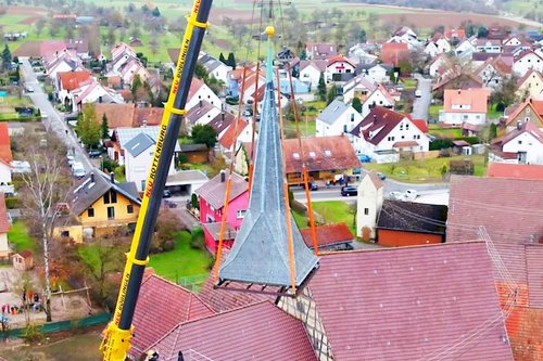 Eine fliegende Turmspitze sieht man nicht alle Tage. So geschehen in Mötzingen bei der Sanierung der Mauritius-Kirche.