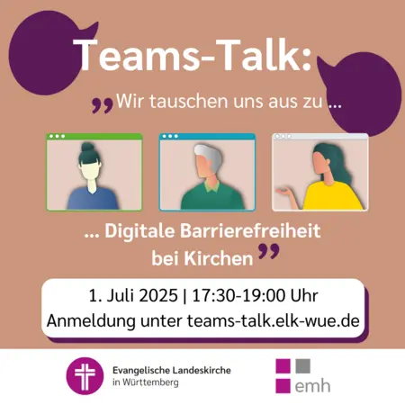 Menschen nicht nur willkommen heißen, sondern Ihnen auch den passenden Weg bereiten! Digitale Barrierefreiheit ermöglicht allen Menschen Teilhabe – unabhängig von Fähigkeiten, Alter oder Lebensumständen. Das kommende Barrierefreiheitsstärkungsgesetz (BFSG) betont die Bedeutung barrierefreier digitaler Angebote. Wie man das umsetzt, darum geht es im Teams-Talk des Ev. Medienhauses Stuttgart am 1. Juli 2025 um 17:30 Uhr mit Linn Loher, Beauftragte für Chancengerechtigkeit der Ev.-Luth. Kirche in Bayern.