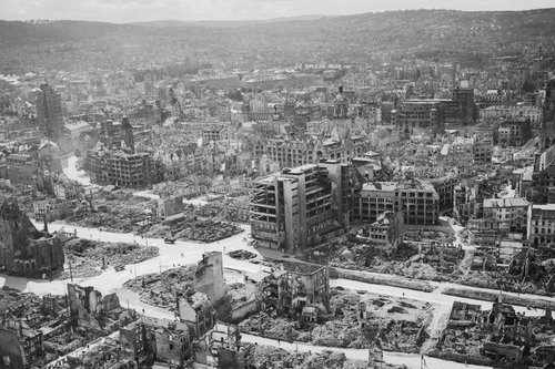 Die zerstörte Stuttgarter Innenstadt aus der Sicht einer britischen Bomberbesatzung.