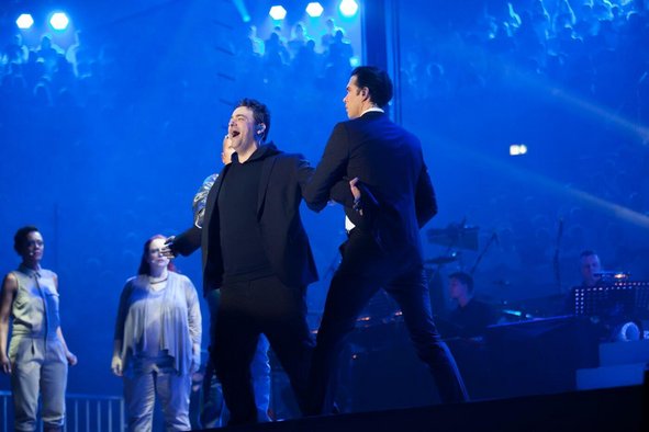 Der Star ist bei „Luther“ der Chor: Er unterstützt stimmgewaltig die dreizehn Solistinnen und Solisten und ist durch die schiere Masse an Menschen beeindruckendes Bühnenbild zugleich. Damit alle Einsätze sitzen, haben sich die teilnehmenden Einzelsänger und Chöre ein Jahr lang auf den Abend vorbereitet. Dirigiert werden sie von Landeskirchenmusikdirektor Matthias Hanke und Kirchenmusikdirektor Hans-Martin Sauter. Die Energie zwischen den beiden und dem Chor ist spürbar und überträgt sich auch auf die Zuschauer. Im Publikum wippt es mit und immer wieder ertönt tosender Applaus, bevor es mit dem nächsten Stück weitergehen kann.