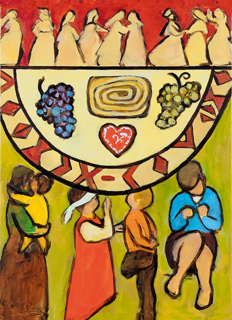 Die Künstlerin Rezka Arnuš hat das Motto des Weltgebetstags „Kommt, alles ist bereit“ bildlich umgesetzt: Ein Tisch ist einladend gedeckt mit traditionellem slowenischen Honiggebäck sowie roten und weißen Weintrauben. Frauen tanzen im oberen Teil des Bildes. Unterhalb des Tisches finden sich Menschen, die sonst ausgegrenzt werden: Arme, Geflüchtete, Kranke und Obdachlose.