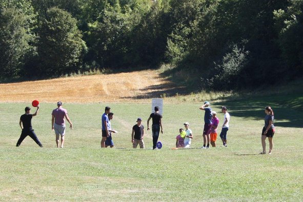 Zum Mitmachen gibt es viel. An diesem Vormittag sind es sieben verschiedene Workshops. Die Jugendlichen können nicht nur Discgolf spielen, sondern auch T-Shirts bedrucken oder den Kletterturm bezwingen. Einige sind unterwegs beim Geocachen, eine kleine Gruppe lernt ein paar Akkorde auf der Gitarre. Wieder andere beschäftigen sich gemeinsam mit Geschicklichkeitsspielen. Beim Nagelworkshop sitzen die Jugendlichen im Schatten an einem Biertisch und hauen hunderte Nägel in Bretter. So entstehen die Worte „Love“ und „Frieden“.