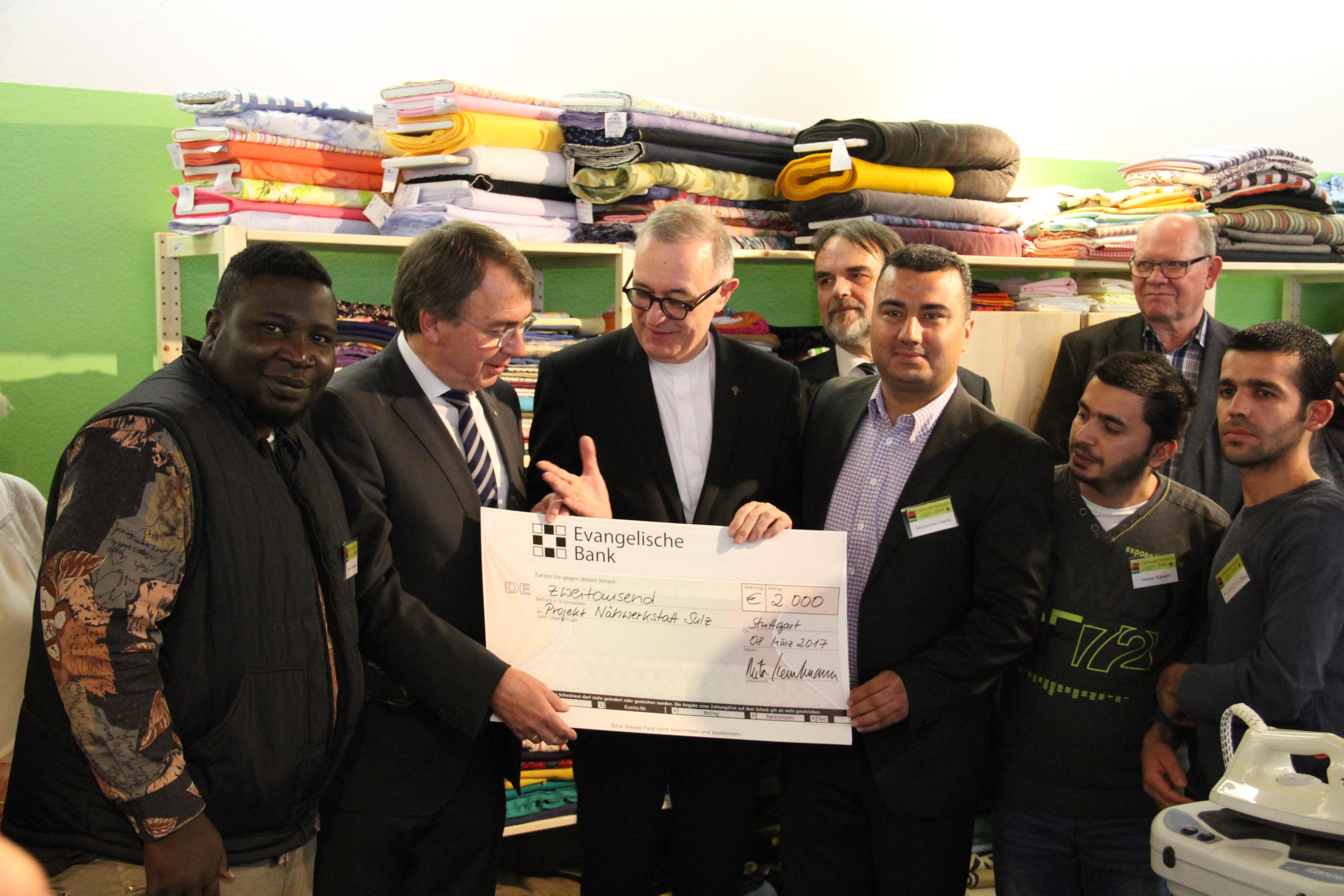Oberkirchenrat Dieter Kaufmann betonte, die Hilfe für Flüchtlinge müsse den einzelnen Menschen im Blick haben. „Wir müssen das Unsere dazu beitragen, dass niemand mit einer betrübten Seele leben muss“, sagte der Vorstandsvorsitzende des Diakonischen Werks in Anlehnung an ein Psalmwort der Bibel. Die Evangelische Landeskirche in Württemberg fördere die Integration von Flüchtlingen, so Kaufmann. So habe die Kirche zahlreiche Stellen für Koordinatoren in der Flüchtlingsarbeit geschaffen. Zudem unterstütze sie mit einem Fonds Integrationsprojekte – auch die Sulzer Nähwerkstatt: Bischof July und Oberkirchenrat Kaufmann überreichten der Werkstatt einen Scheck in Höhe von 2.000 Euro.