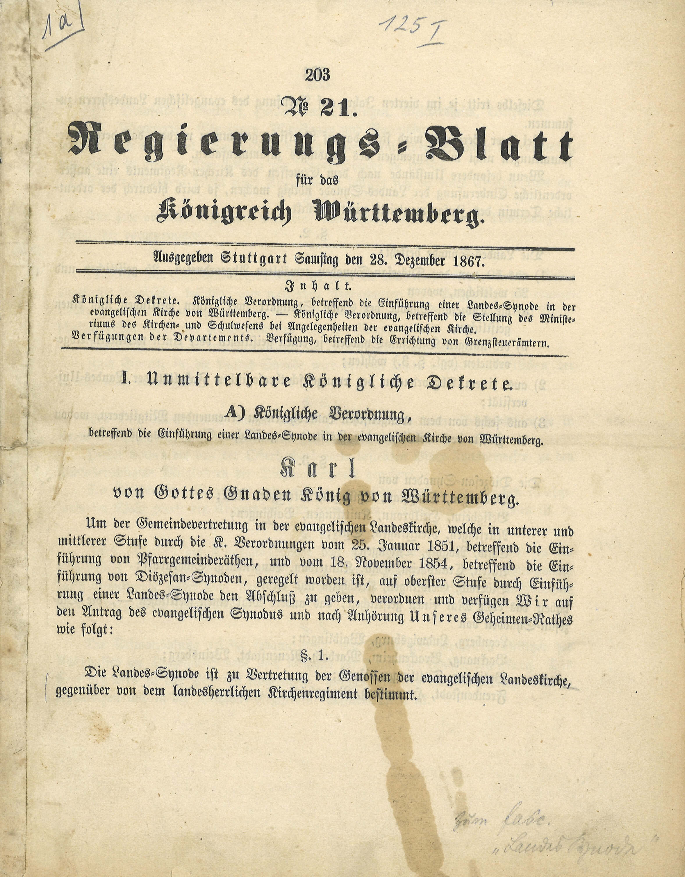 Es war ein weiter Weg, bis die evangelische Landeskirche im Königreich Württemberg eine gewählte Vertretung aller Kirchenglieder bekam, die Landessynode. Am 18. Februar 1869 tagte sie zum ersten Mal in der Stuttgarter Schlosskirche.