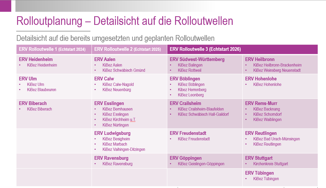 Zum 01.01.2026 werden weitere elf Evangelische Regionalverwaltungen mit insgesamt 26 Kirchenbezirken (bzw. 19 Kirchenbezirken nach abgeschlossenen Fusionsprozessen) auf das doppische Finanzwesen umgestellt. Zur Vorbereitung dieser dritten und zugleich letzten Rolloutwelle einschließlich der Einführung von Infoma newsystem sind eine Vielzahl von Punkten zu beachten und im Jahresverlauf 2025 vielfältige (Vor-)Arbeiten auszuführen. Bereits vor Jahresende 2024 fanden „Onboarding-Veranstaltungen“ mit den Leitungen der tangierten ERVen sowie mit den benannten Keyusern statt. Die Keyuser übernehmen in zentraler Schlüsselrolle die fachliche Betreuung vor Ort, führen etwa Umstellungsarbeiten selbst durch bzw. begleiten die Mitarbeitenden bei Umstellungstätigkeiten und leiten diese entsprechend an.