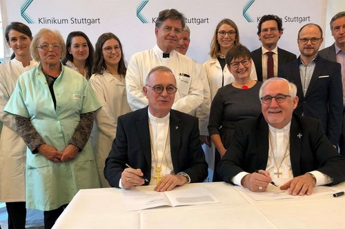 Januar 2020, die Corona-Krise war noch weit: Landesbischof Dr. h. c. Frank Otfried July (sitzend, links) hat mit Bischof Dr. Gebhard Fürst im Klinikum Stuttgart die Rahmenvereinbarung zur ökumenischen Klinik-Seelsorge unterzeichnet. Direkt hinter July beobachten der Ärztliche Direktor der Klinik für Allgemeine Innere Medizin, Professor Dr. Wolfram G. Zoller, und sein Team die Szene. Zu den Beobachtern der Unterzeichnung gehörten auch der Medizinische Vorstand am Klinikum, Professor Dr. Jan Steffen Jürgensen (hintere Reihe, 3. v. r.) und Pfarrer Thomas Dreher, Vorsitzender des Konvents der Evangelischen Krankenhaus- und Kurseelsorge Württemberg (r.)