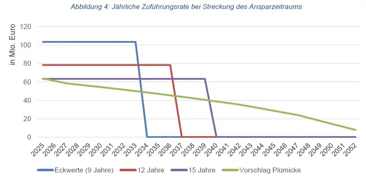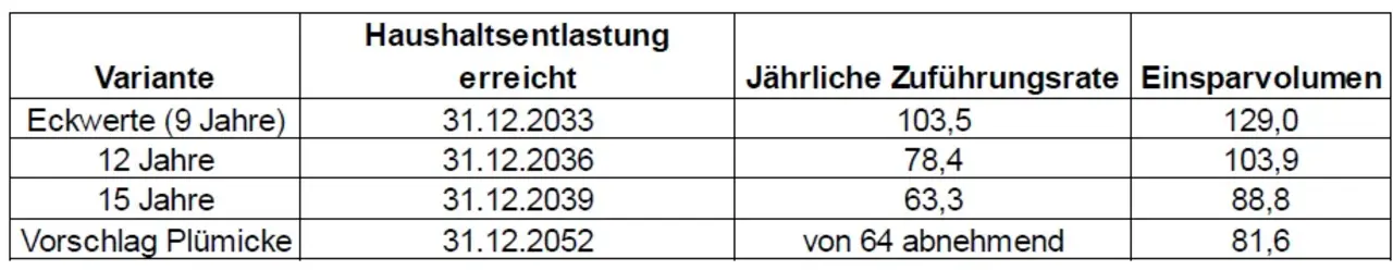 Wenn man den Ansparzeitraum auf 12 Jahre, 15 Jahre oder länger streckt, ändert das nichts am gesamten Einsparvolumen. Es bleiben 970 Mio. Deckungslücke bei der Versorgung, in jedem Rechenbeispiel. Ob wir 12, 9 oder irgendeine andere Zahl als Parameter einsetzten, die Herausforderung wird dadurch nicht kleiner.