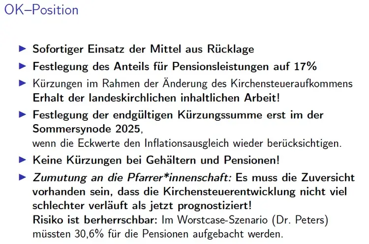 Um die Altersversorgung der landeskirchlichen Beamten und Beamtinnen, vor Allem im Pfarrdienst, sicherstellen und gleichzeitig den Haushalt solide aufstellen zu können, muss die Landeskirche in den kommenden Jahren massiv Rücklagen aufbauen. Dafür sind einschneidende Sparmaßnahmen nötig.
