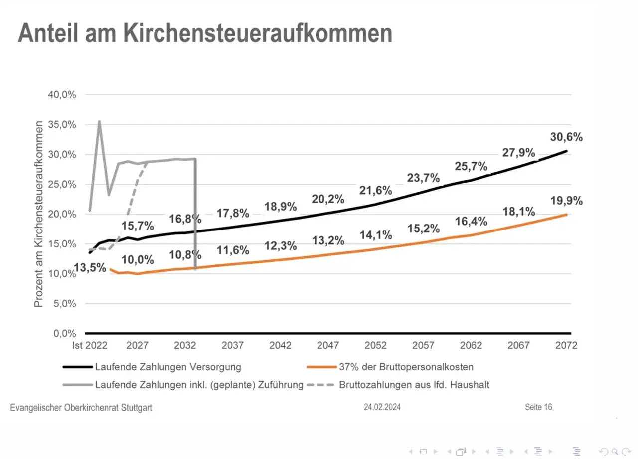Der Oberkirchenrat habe vorgeschlagen, diese Summe auf neun Jahre (von 2025 bis 2033) zu je 103,54 Mio. Euro zu verteilen. Da zugleich die Mitgliederzahlen und die Kirchensteuereinnahmen rückläufig seien, steige dieser Betrag auf 129 Mio. Euro, um einen ausgeglichenen landeskirchlichen Haushalt sicherzustellen.