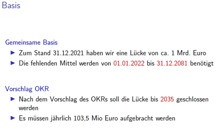 Zum Zeitpunkt des letzten versicherungsmathematischen Gutachtens (31.12.2021) hätten verbeamtete Beschäftigte in Summe Versorgungsansprüche in Höhe von 3,9 Mrd. Euro erworben. Aufwändige Berechnungen haben ergeben, dass der Landeskirche dafür rund 1 Mrd. Euro an Deckungskapital fehlt, die angespart werden müssen.