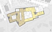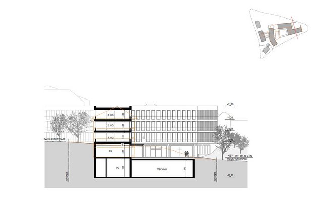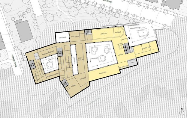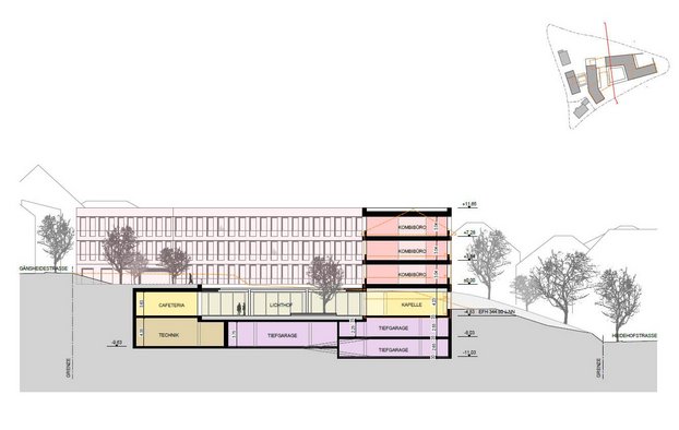 Das funktionale Verwaltungsgebäude der Evangelischen Landeskirche in Württemberg besteht aus drei Baukörpern, die auf einem zusammenhängenden Sockelgeschoss stehen, das die Gebäudeteile miteinander verbindet. Da das Gelände stark geneigt ist, ist das Sockelgeschoss in Teilen erdüberdeckt konzipiert. Dort ist also eine offene Grünfläche entstanden, durch die ein öffentlicher Weg quer über das Grundstück führt. Das Sockelgeschoss dient als zentraler Kommunikationsbereich für alle Besucherinnen und Besucher, Mitarbeiterinnen und Mitarbeiter des Oberkirchenrats. Auch die Mitglieder der Landessynode nutzen es etwa für ihre Ausschuss-Sitzungen. Im Sockelgeschoss finden sich der Empfangs-, Kapellen-, Konferenz- und Cafeteriabereich auf rund 4.000 Quadratmetern. In den darüber liegenden Stockwerken gibt es offene Büroflächen mit rund 300 Arbeitsplätzen In den Untergeschossen sind neben der Tiefgarage auch Werkstätten, Umkleidebereiche, IT-Bereiche, Lagerräume - z. B. für Material für Gemeinden -, sowie die Registratur untergebracht.