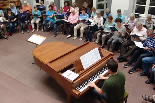 Die Kantorei Echterdingen und ihr Leiter, Bezirkskantor Sven-Oliver Rechner (am Flügel), während Proben bei einer Chorfreizeit.